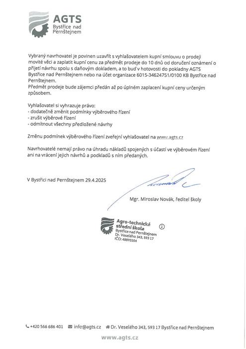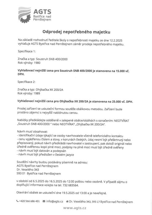 Úvod > Škola > Aktuality > AGTS Bystřice nad Pernštejnem nabízí k odprodeji nepotřebný majetek